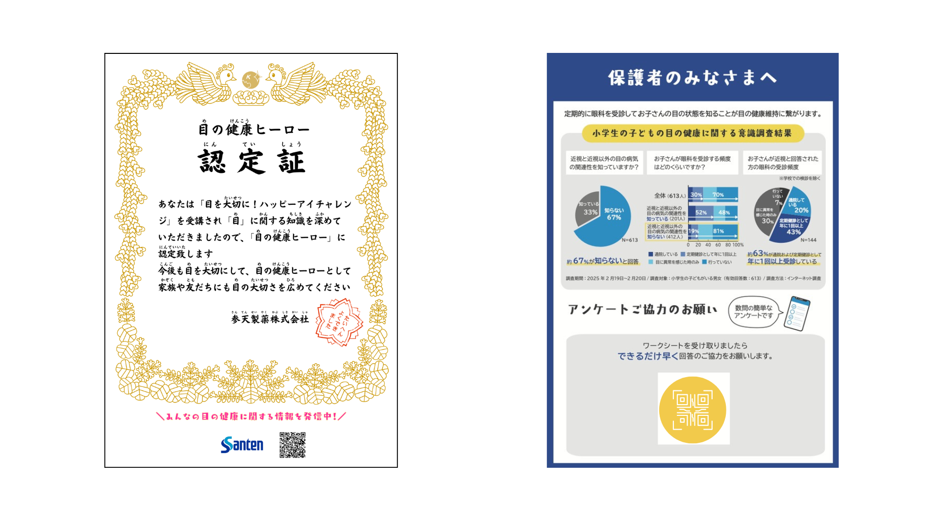 これを実現するため、授業内に3つのミッションを設け、そのうち1つを「おうちでやってみよう」としました。さらに、授業後には、子どもたちに「目の健康ヒーロー認定証」を配布し、その裏面に保護者向けのリーフレットを添付しました。リーフレットには、家庭で簡単にできる視力チェックの方法や日常生活で気をつけたいポイントをわかりやすくまとめています。