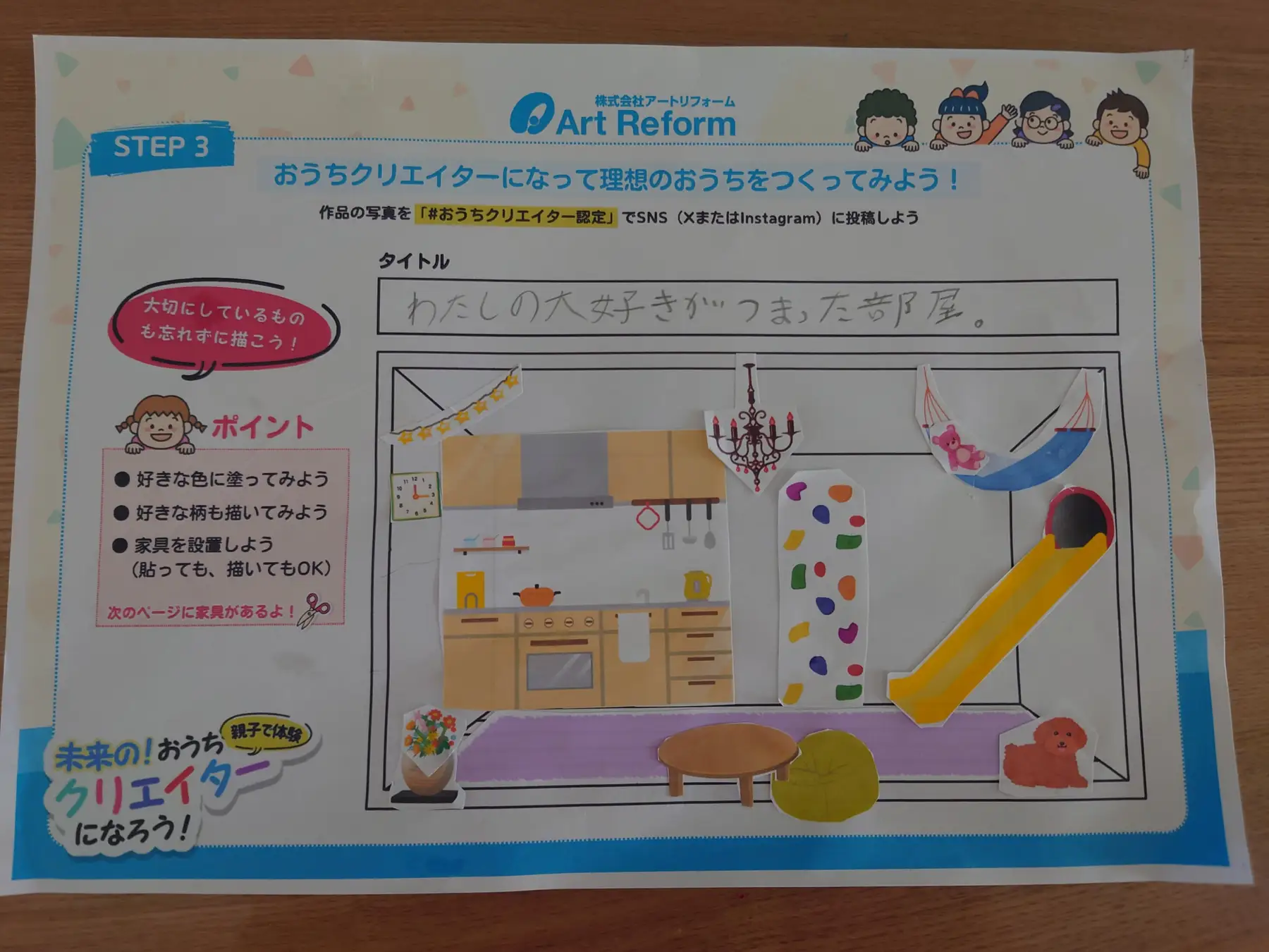 「家づくりの楽しさ」や「暮らしを豊かにする発想」を親子で体験できるプログラムです。普段なかなか触れる機会の少ない「リフォーム」について知り、ワークショップを通じて理想のお家を考えました。「授業後も一生懸命、理想のお部屋を描いていた」という方が多く、知的好奇心をくすぐるようなコンテンツとなりました。