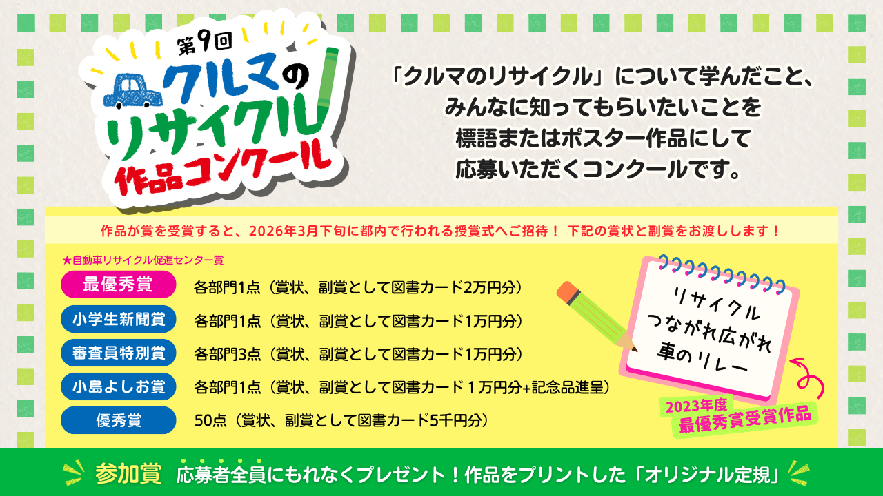 下記の賞状と副賞をお渡しします。●最優秀賞(自動車リサイクル促進センター賞) …各部門1点(賞状、副賞として図書カード2万円分)