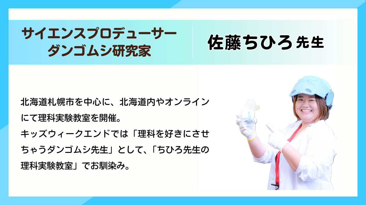 北海道札幌市を中心に、北海道内やオンラインにて理科実験教室を開催。キッズウィークエンドでは「理科を好きにさせちゃうダンゴムシ先生」として、「ちひろ先生の理科実験教室」でお馴染み。
