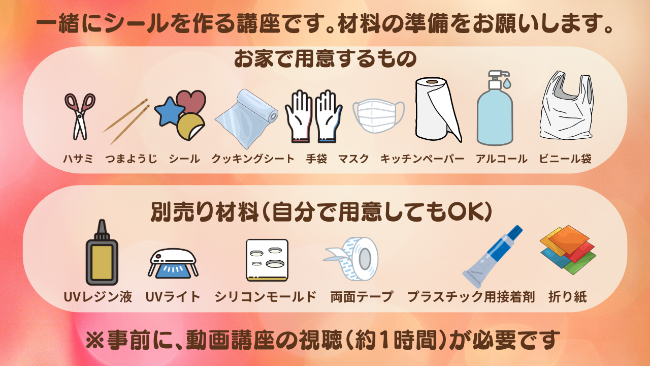 zoomをつないで一緒にぷっくりシールを作ります!また、まだレジンの道具がない人、自分で道具を探して購入するのが難しい人には、