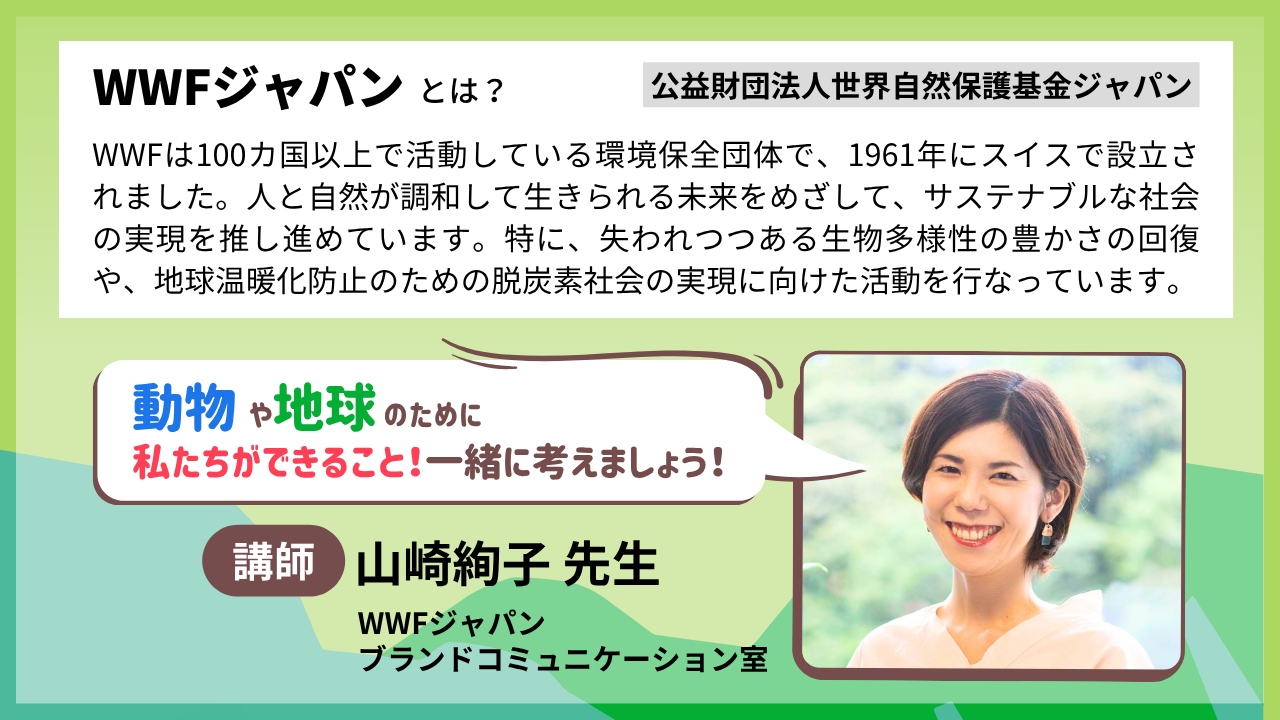 ◎講師:WWFジャパン(公益財団法人世界自然保護基金ジャパン) ブランドコミュニケーション室 山崎絢子先生2024年11月に開催し、大好評だったWWFジャパンの授業が帰ってきます。