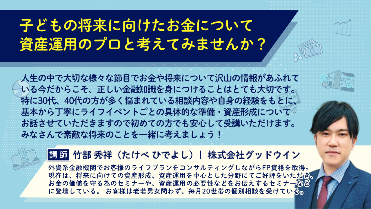 特に30代、40代の方が多く悩まれている相談内容や自身の経験をもとに、基本から丁寧にライフイベントごとの具体的な準備・資産形成についてお話させていただきますので初めての方でも安心して受講いただけます。みなさんで素敵な将来のことを一緒に考えましょう!