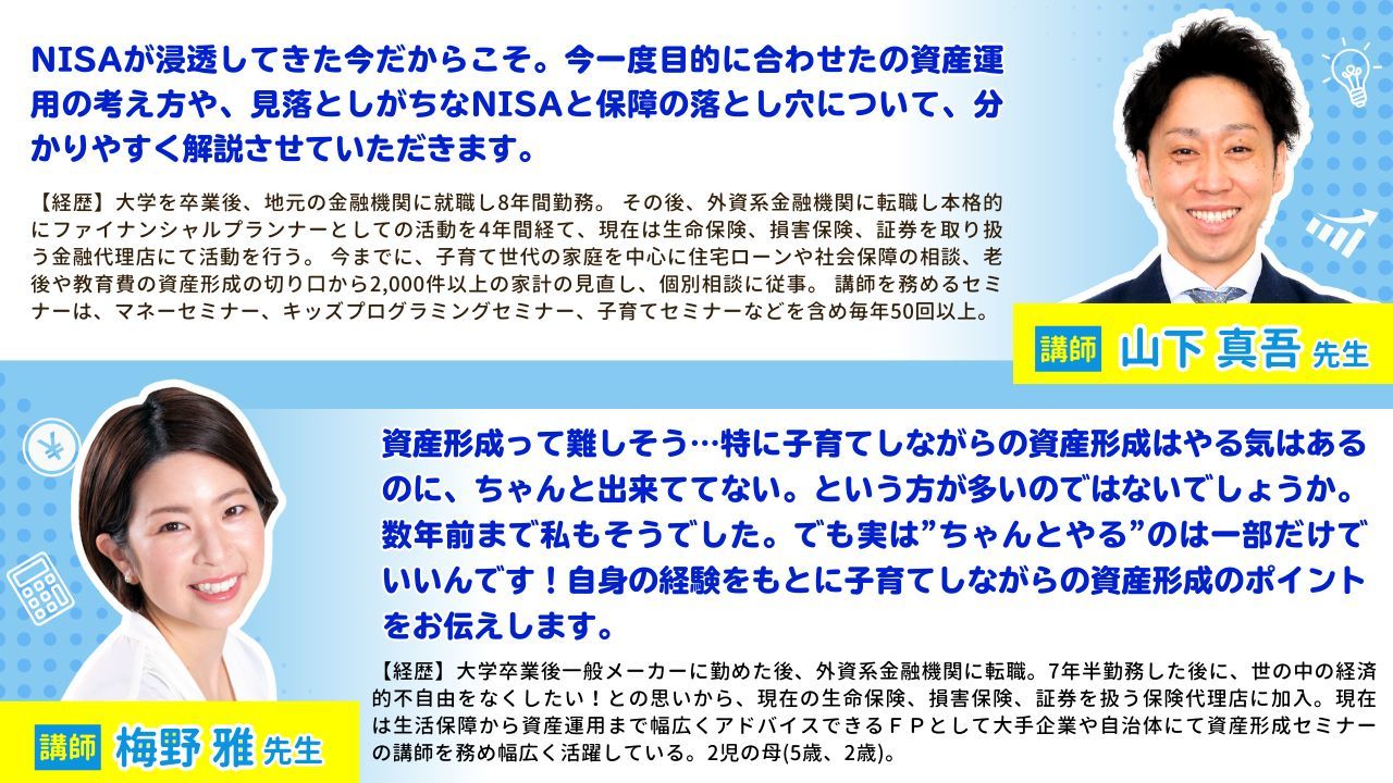 ご希望の方には、今回講師を担当していただく、山下先生または梅野先生に、個別にファイナンシャルプランのご相談(無料)をお申込み頂くことが可能です!(詳細はセミナー内でご案内致します)<無料個別相談> は、相談内容が決まっていない方も大歓迎です!