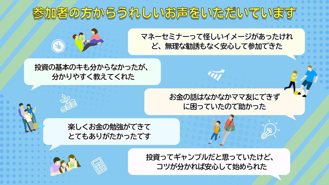 ・セミナーの内容について、もう少し詳しく聞いてみたいなどなど、家計の見直し、保険の見直し、年金・退職金、相続・贈与、住宅相談・貯金・資産の増やし方を知りたい方も、ぜひご参加ください!