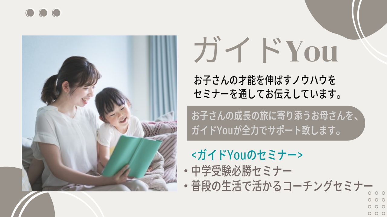 お子さんの目標達成や成長の旅を上手にガイドして頂けるよう、私どもがお母さんを全力でガイド致します。---ガイドYou 主なセミナー---