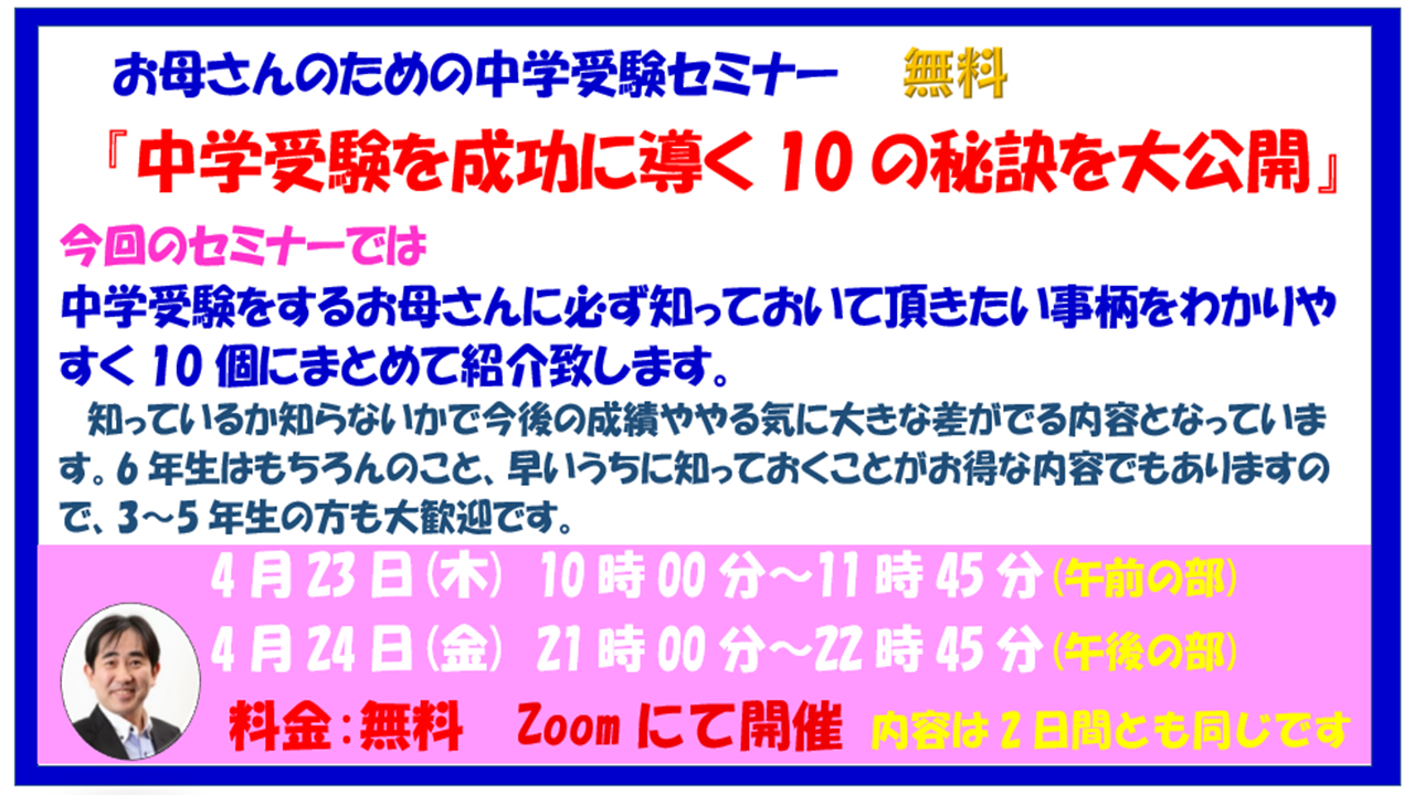 新学期で予定も立て難い時期だとは思いますが、悔いのない受験をするため、そしてお子さんの将来のために是非ご参加ください。6年生はもちろんですが早いうちに知っておくことがお得な内容でもありますので3~5年生の方も遠慮なくご参加ください。