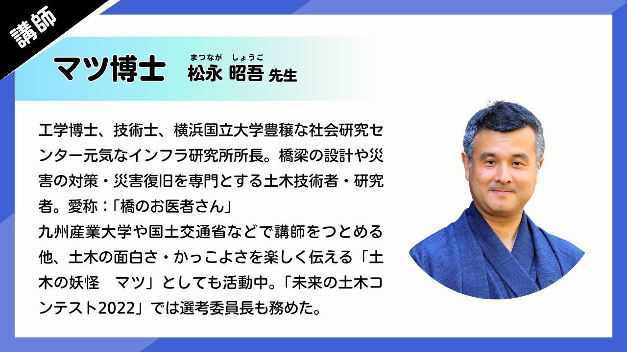 工学博士、技術士、横浜国立大学豊穣な社会研究センター元気なインフラ研究所所長。橋梁の設計や災害の対策・災害復旧を専門とする土木技術者・研究者。日本のほか、アフリカ、中央アメリカなどの開発途上国を中心に活躍している。九州産業大学や国土交通省などで講師をつとめるほか、土木の面白さ・かっこよさを楽しく伝える「土木の妖怪 マツ」としても活動中。公益社団法人土木学会主催の「未来の土木コンテスト2022」では選考委員長も務めた。