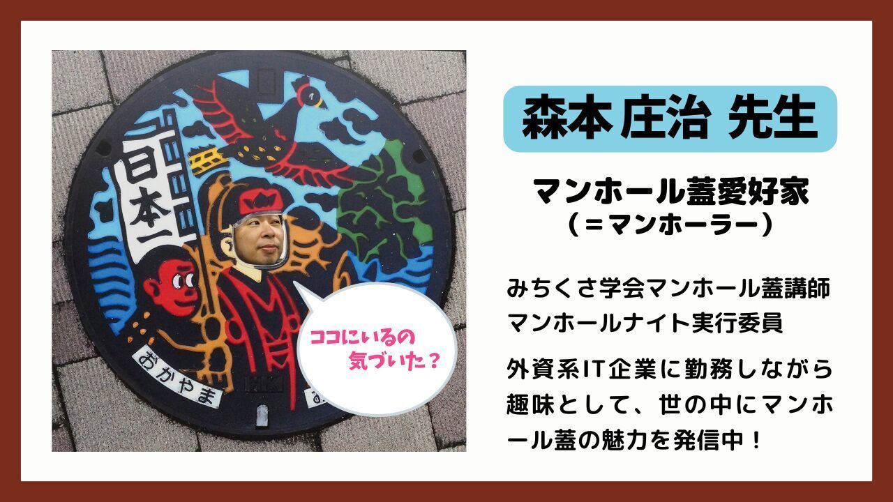 みちくさ学会マンホール蓋講師、マンホールナイト実行委員。外資系IT企業に勤務しながら、趣味として世の中にマンホール蓋の魅力を発信中!きっかけは2007年に訪れた奈良井宿や松本市のマンホール蓋。その美しい蓋に感動し、魅力に取り憑かれ、蓋を求めて日本全国を旅することに。2021年より毎年、東京都「TOKYOデザインマンホールデジタルラリー」に協力。デザインマンホールの魅力を紹介するオリジナル動画や、イベントに出演。