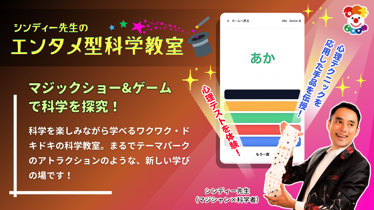 さまざまな科学テーマを、マジシャン×科学者のシンディー先生が、マジック&ゲームで徹底的にエンタメ化してお届けします。科学好きな子はもちろんのこと、科学嫌い・苦手意識を持った子も、「え、科学ってこんなに楽しいの!?」と思ってもらえること、間違いなしです!【講師紹介:シンディー先生(科学を使って魔法を生み出すスーパー理系マジシャン♪)】