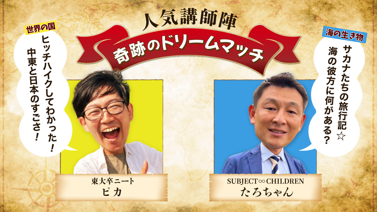 手に汗握る熱狂ライブを、みんなで見届けよう!\\キミの人生を変えちゃう旅(まなび)が見つかる!?豪華授業・講師ラインナップ!(10分間×5テーマ)//