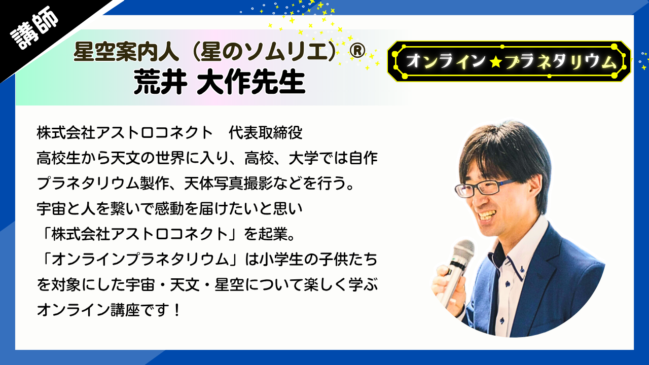 講師は、TVやラジオなどでも取り上げられた「オンラインプラネタリウム」の司会・解説を行っている荒井が行います。実際の星空の下で開催される「星空ツアー」や天体望遠鏡を使っての「天体観察会」などの支援を20年近くおこなった経験を元に、分かりやすく、楽しく宇宙や星空を解説いたします。