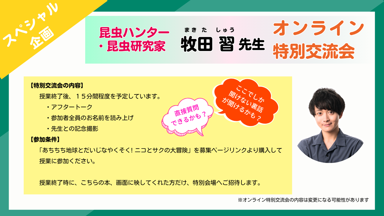 「あちちち地球とだいじなやくそく! ニコとサクの大冒険」を持って参加してくれた方は、授業後開催の牧田さんとの特別オンライン交流会にご招待!特別オンライン交流会では、牧田さんと記念撮影をしたり、名前を呼んでもらえるかも!?(詳細は上の画像を確認してね♬)
