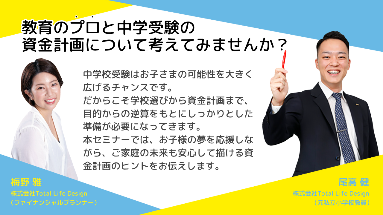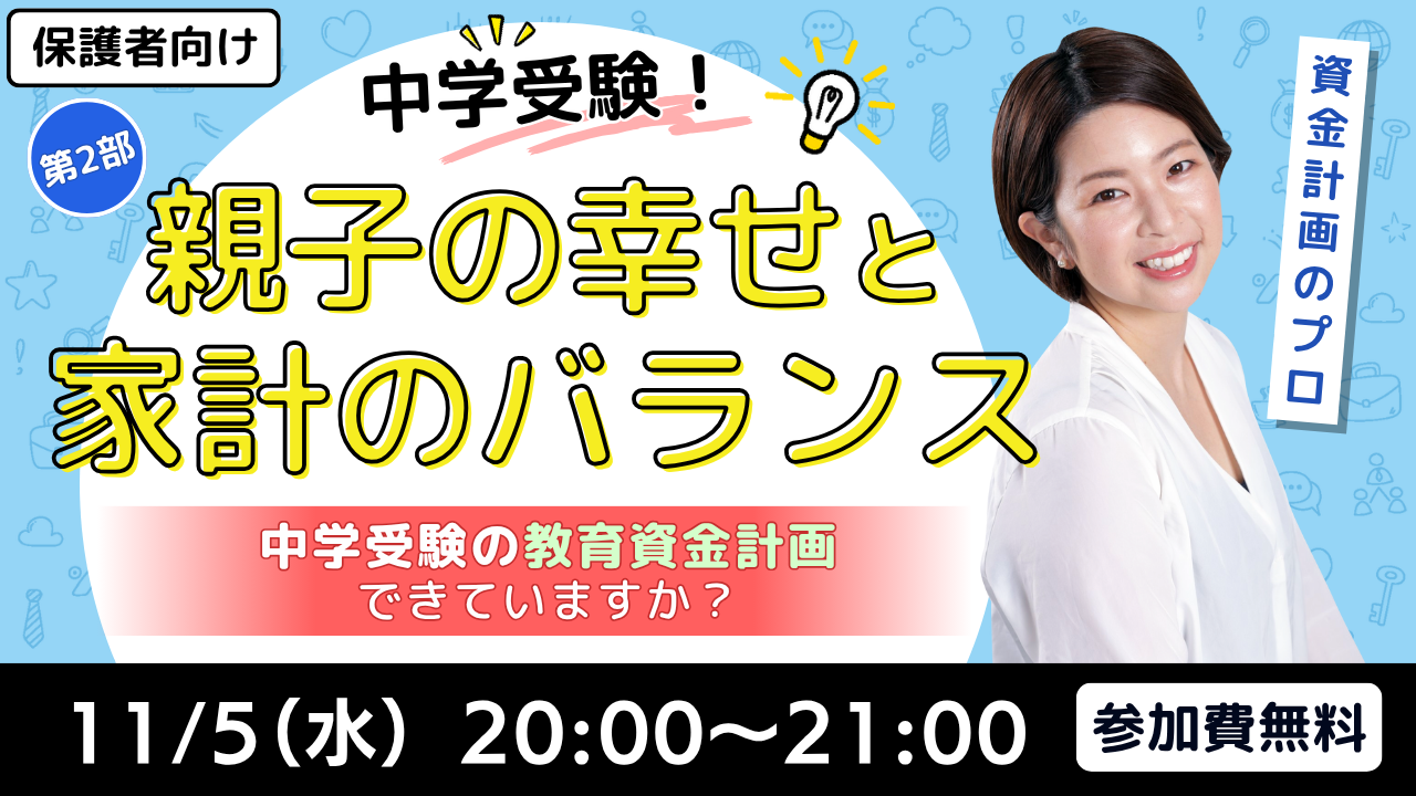 大人気のオンラインマネーセミナーを開催します◎元私立小学校で5年間教員を務めた講師とファイナンシャルプランナーが中学受験に向けての心構えと資金計画の考え方をご紹介します。